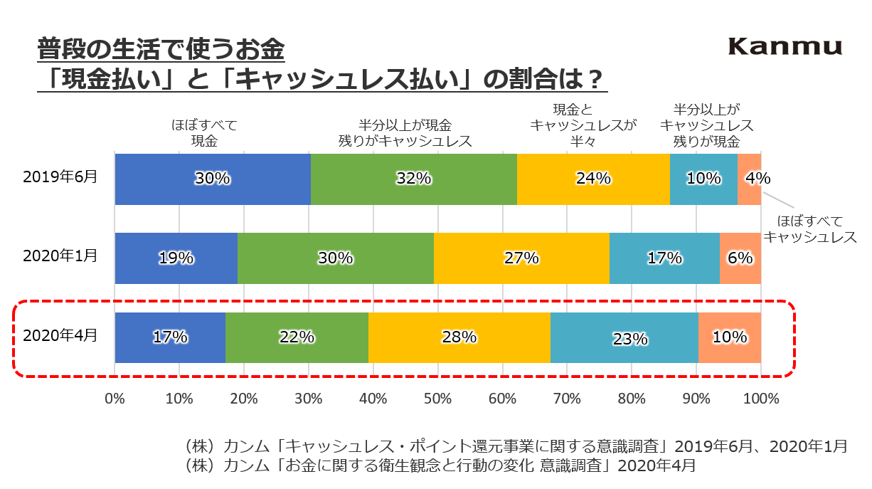 過去のアンケート結果と比較して、半分またはそれ以上をキャッシュレスにしている人の合計をみると、2019年6月(37%)と2020年1月(51%)からさらに増え、57%となりました。 少数派だった「ほぼすべてキャッシュレス」の人も、ここ3ヶ月の増加幅が大きくなっています
