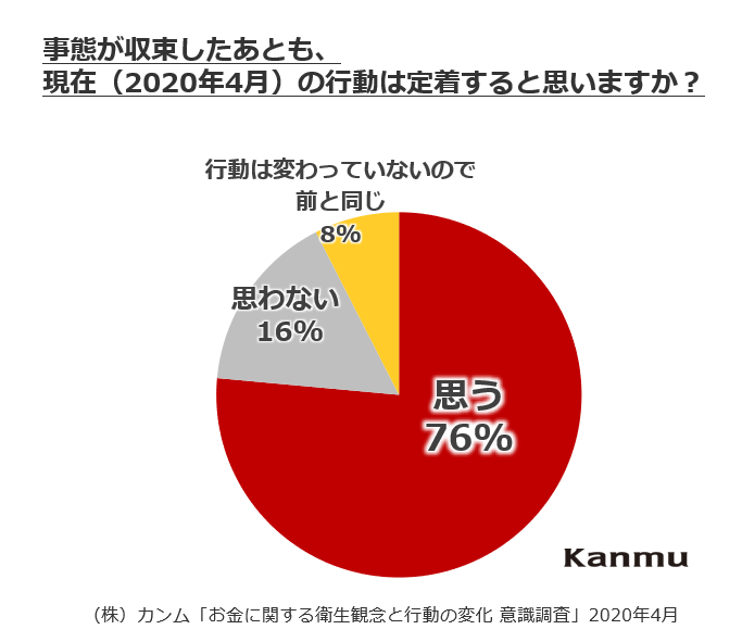 この騒動が収束したあとも「現在の行動が定着すると思う」と答えた人は76%です。一度向上した衛生意識は、感染の恐れが遠ざかったあとも維持されると予想できます。