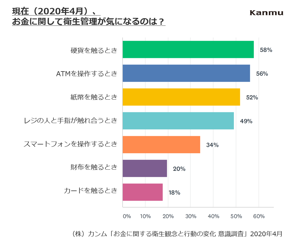 やはり現金に直接触れるときが気になるようです(「硬貨を触る(58%)」「紙幣を触る(52%)」)。それと並び、ボタンから現金取り出し口まで無数の人が触っているATMを操作するときも過半数が気にしています(56%)。